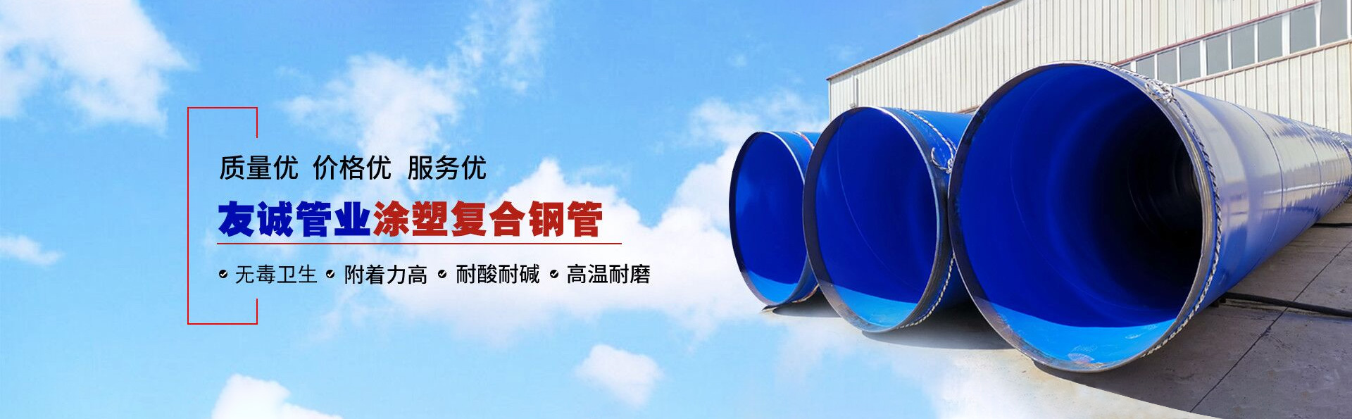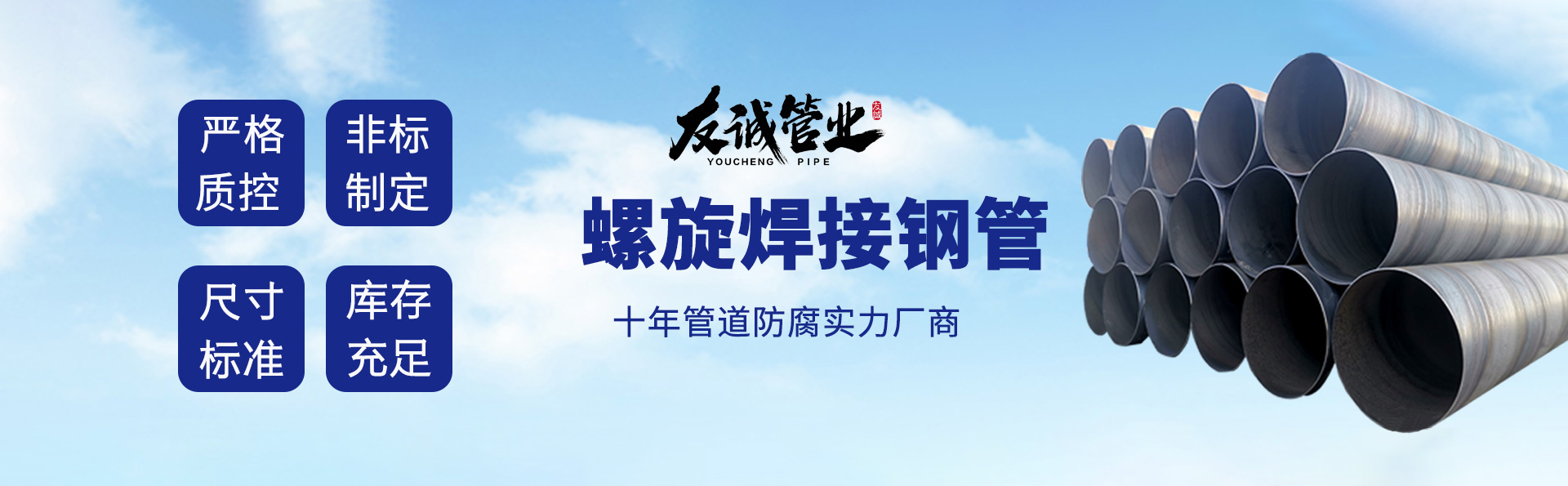 滄州友誠(chéng)管業(yè)有限公司是一家專業(yè)從事生產(chǎn)防腐涂塑管道及管件于一體的大型企業(yè)。公司注冊(cè)資金8600萬(wàn)元,位于中國(guó)管道生產(chǎn)基地—河北鹽山縣,近靠京滬高速、榮烏高速、黃石高速30公里,高鐵滄州西站40公里,天津國(guó)際機(jī)場(chǎng)、濟(jì)南遙墻機(jī)場(chǎng)150公里,為客戶來訪及業(yè)務(wù)發(fā)展提供了便利的交通條件。 鋼管系列:螺旋鋼管、無(wú)縫鋼管、ERW直縫焊管、JCOE埋弧焊直縫鋼管、熱鍍鋅鋼管。 涂塑系列:內(nèi)外涂塑鋼管、涂塑復(fù)合鋼…… 了解更多
